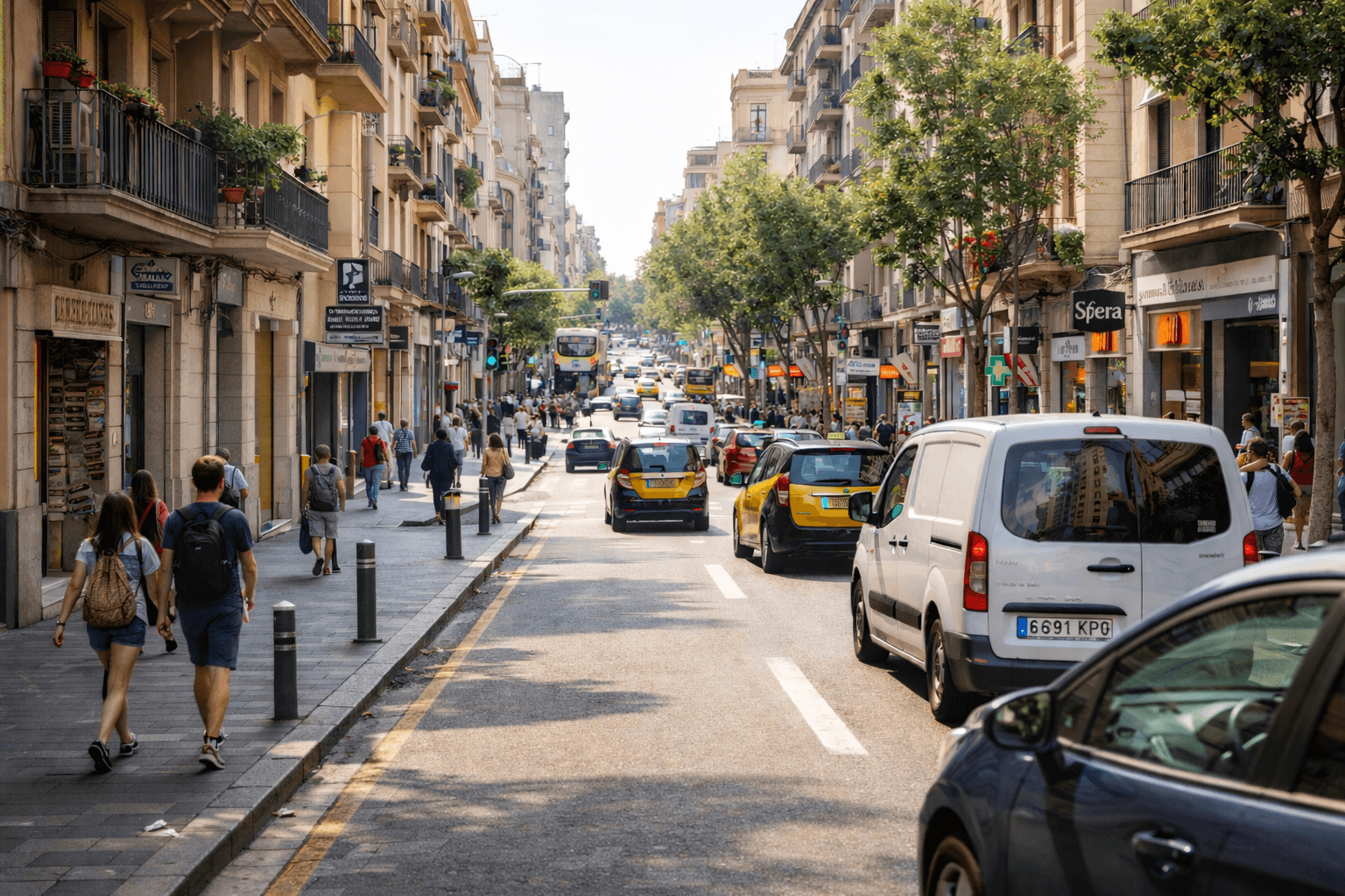 Carrer de Sants es una de las vías comerciales más largas de Europa y concentra una gran actividad diaria de vehículos particulares y comerciales.